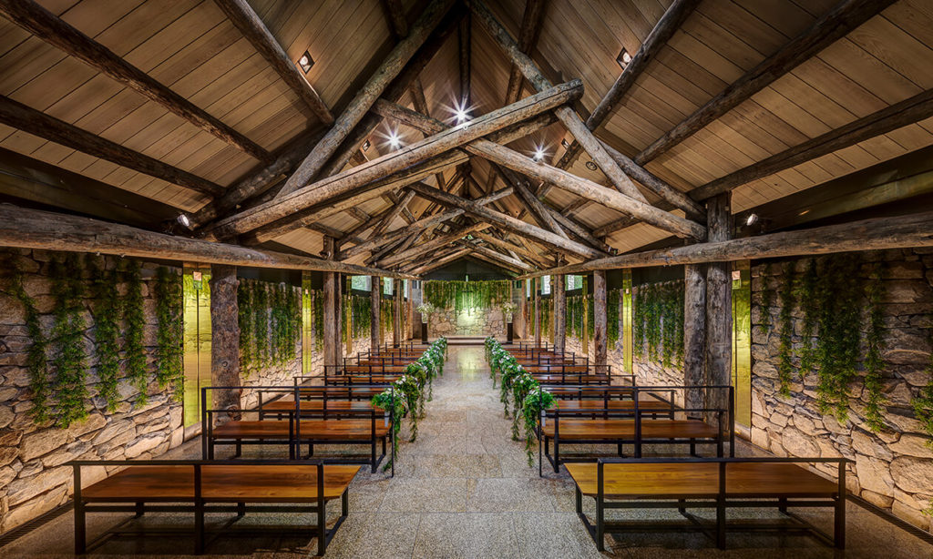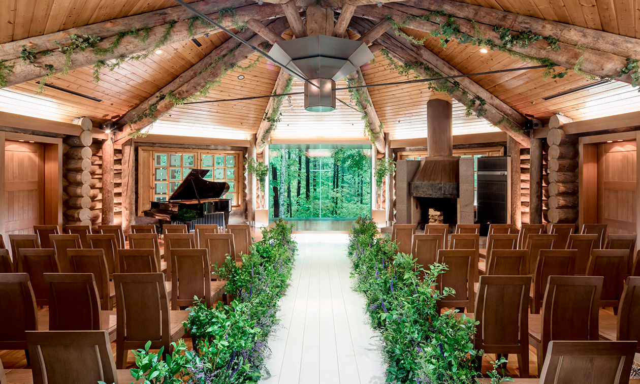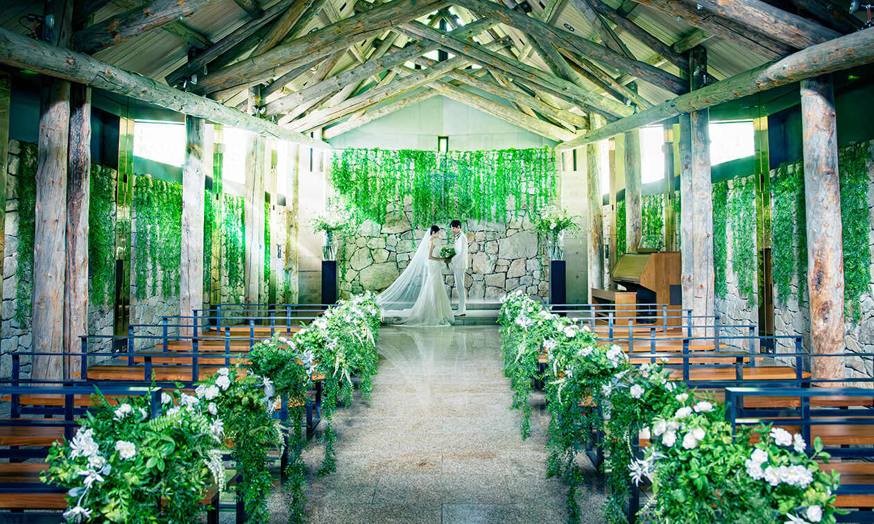 上品な色彩と質感の石を祈るように積み上げ完成された、世界的建築家 伊丹潤氏の代表作「石彩の教会」と、聖なる木とも呼ばれる稀少な木材、シルバーパインを贅沢にもあますところなく使い、つくり上げた「森彩(もりいろ)の教会」、2つよりお選びいただけます